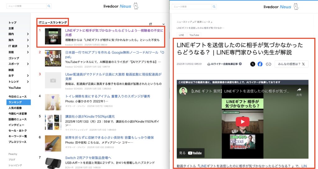 2025年10月14日、月間約3億PVのライブドアニュースにて、当方の2025年10月9日掲載記事が『ITトレンドニュースランキング1位』を獲得しました!