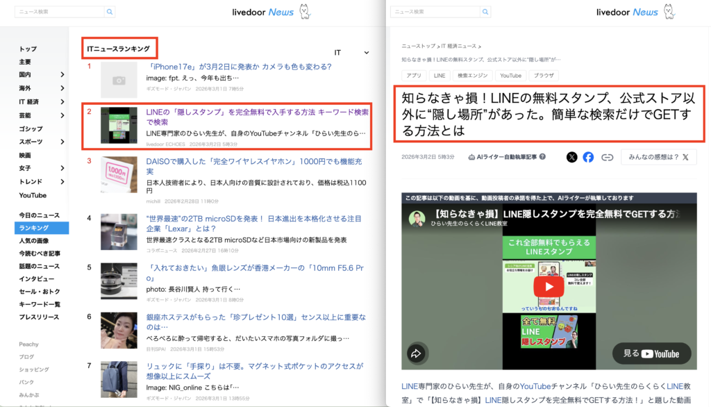2026年3月2日、月間約2億PVのライブドアニュースにて、当方の2026年3月2日掲載記事が『ITニュースランキング2位』を獲得しました!