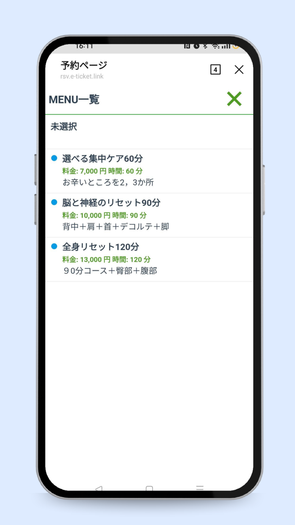 1. コース選択画面: 顧客が希望するメニューを直感的に選択